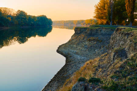 Autumn landscape banner, beautiful landscape with high river bank, reflection, blue sky and yellow sunlight at sunrise. The Kama river. Tatarstan. Russia