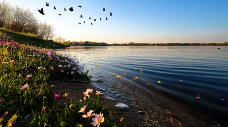 A serene riverbank with vibrant green grass and delicate wildflowers creates a peaceful environment. The soft natural light enhances the beauty of this tranquil scene.