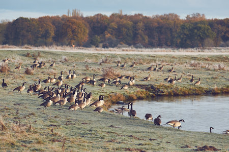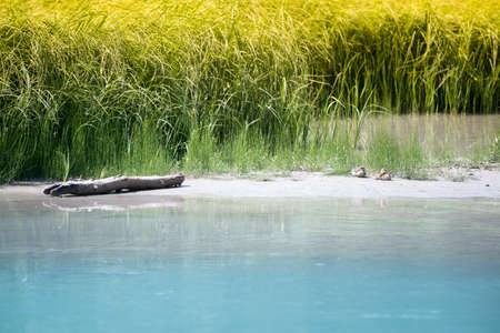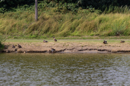The female duck leads the ducklings on a stroll in the waterside meadow