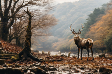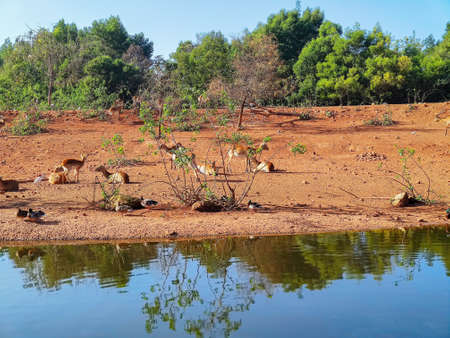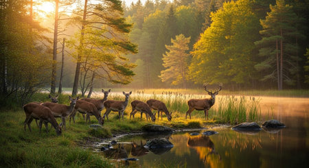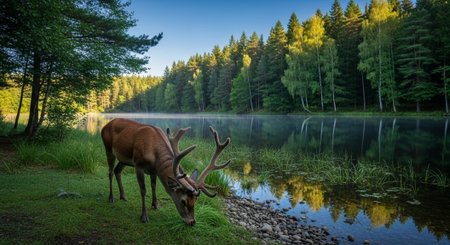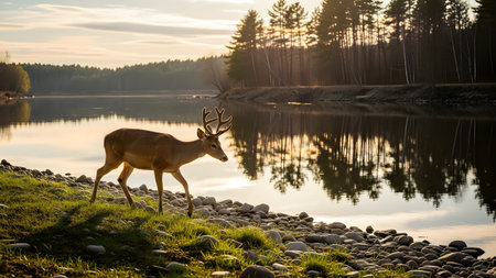 A young deer walks along the pebbled shore of a calm lake during a golden sunset. The reflection of the trees in the water and the warm light create a serene and picturesque wildlife landscape.