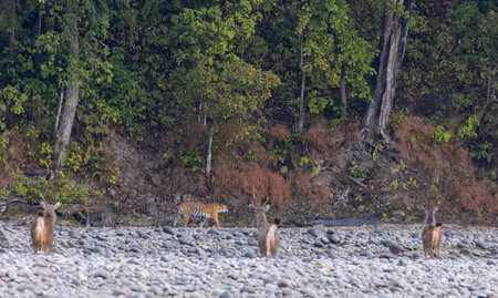 Female tigress (Panthera tigris) at jungle hunting sanbar deer at jim corbett national park.