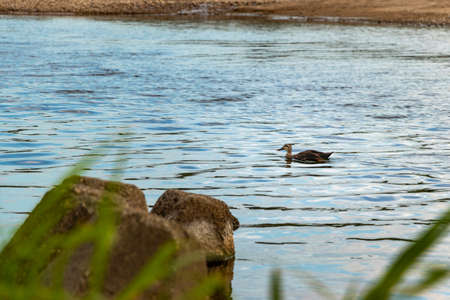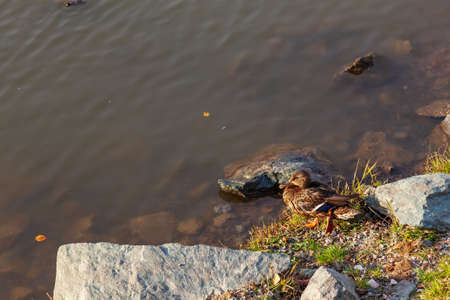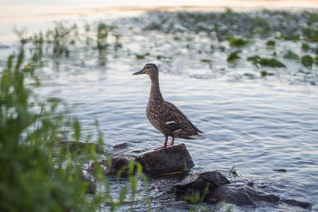 The horizontal photo shows a wild duck waterfowl walking along the banks of a city river in search of food. Next to the bird stones of different sizes, grass. Duck on the sunny side of the coast
