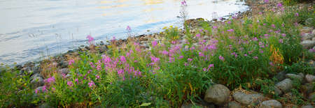 River and a blooming rocky shore on a clear summer day. Pink wildflowers and water surface texture close-up. Finland. Nature, environment. Panoramic image