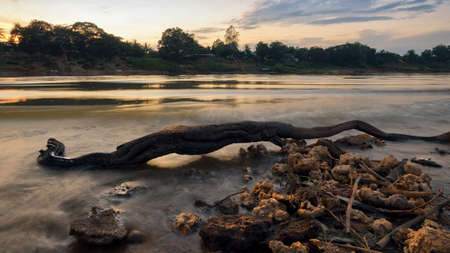 A tranquil riverside setting features gentle water reflections of the sunset. The banks are lined with trees and grasses creating a peaceful atmosphere as the day ends.