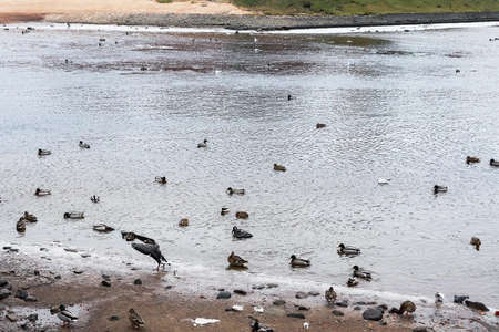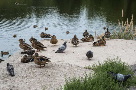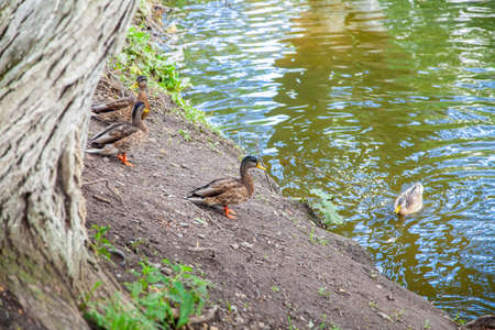the shore of the pond with ducks on the edge of the forest zone - a great place for walking and feeding wild birds