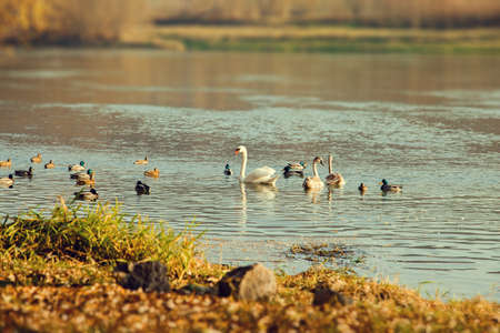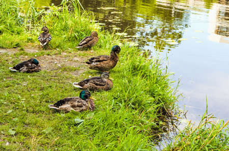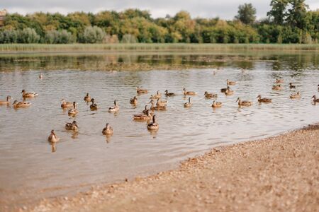 Wild ducks in a natural habitat. Water surface of a forest lake. River.