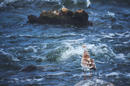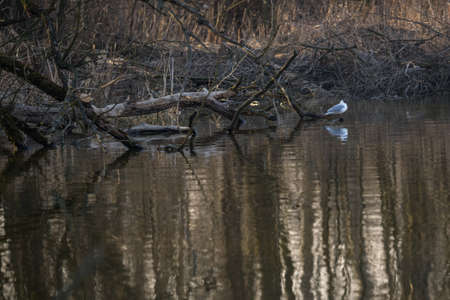 White wild bird standing on rock over water.Mountain landscape of and meadow with green birch forest and calm water surface of the lake.