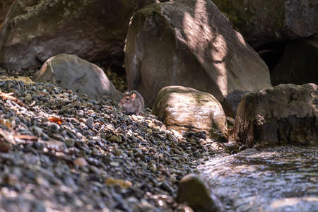 Wild rat in nature. Brown rat. Rattus norvegicus beside water. Lutry, Switzerland. Wildlife and nature.