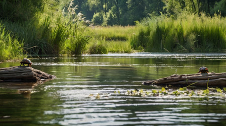 A tranquil scene of two turtles resting on logs in a serene marshland with tall grass under sunlight. The water is calm and reflective, creating a peaceful atmosphere.