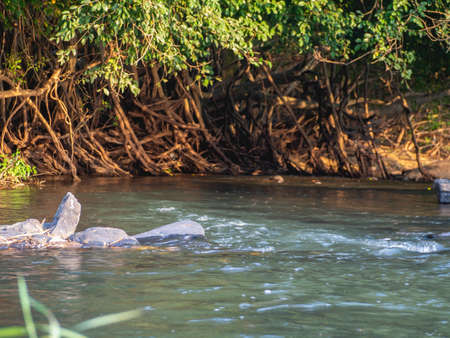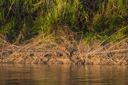 Manu National Park, Peru - August 06, 2017: Family of Capybara at the shores of the Amazon rainforest in Manu National Park, Peru