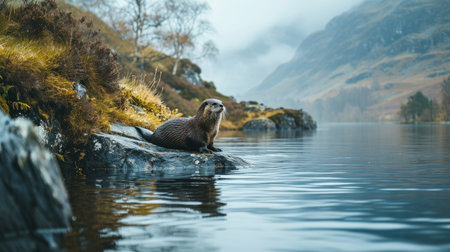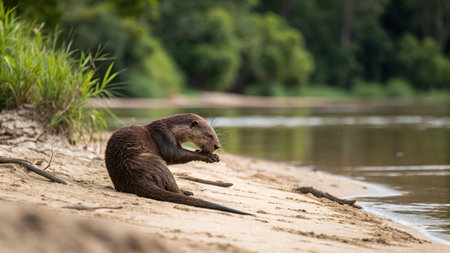 Wild Beaver Rests on Mossy Log, Enjoying Lush Greenery by the Riverbank, Wildlife Portrait