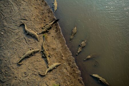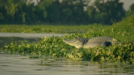 A magnificent crocodile basks on a vibrant green riverbank, surrounded by lush foliage. This serene scene captures the beauty of wildlife in its natural habitat.