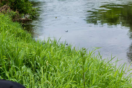 Fresh grass on the banks. Blue dragonflies above the water. The Protva River in Russia in the middle of summer, a great place for tourism.