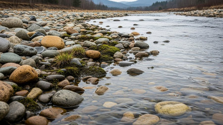 A peaceful riverscape showcasing smooth stones along the water