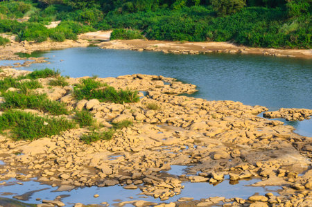 Closeup of rocks in the river with sunlight and green background.