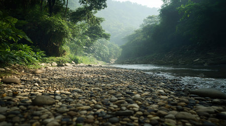 photo of a river trekking trail with pebbles and small boulders along the water, misty hills in the background, soft lighting creating a tranquil atmosphere, professional photo, photorealistic --chaos 10 --ar 16:9 --v 6.1 Job ID: 7cbce08d-6b98-4752-9978-a64693a5e3cf
