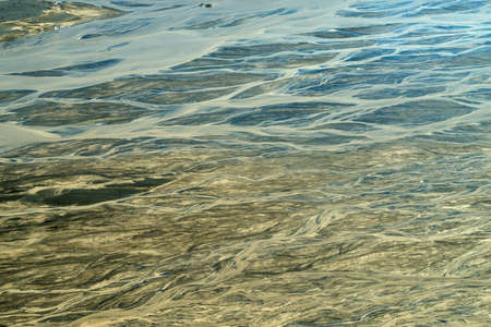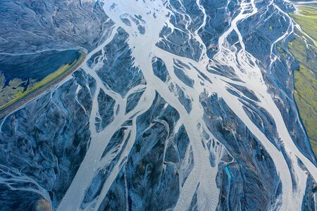 Top view of abstract glacier rivers pattern flowing through volcanic lava field in Icelandic highlands on summer