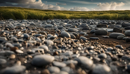 A close-up shot of smooth, round pebbles on a beach, with a grassy meadow and a clear blue sky in the background.