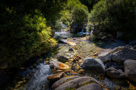 Mountain river in Restonica Valley, Corsica, France, lit by warm morning sunlight