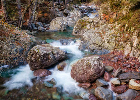 Autumn foliage and dramatic boulders by the Golo river at the Torrent de Cipetto near Barchetta in Corsica