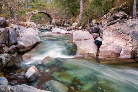 View of an old arched bridge on a river in Corsica, France