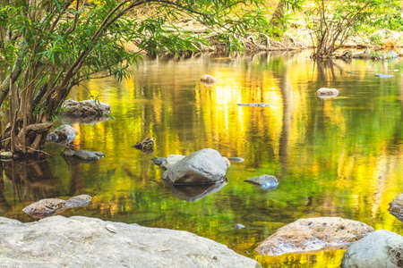 River stone and tree with sun light, View water river tree, Stone river and sun ray in forest