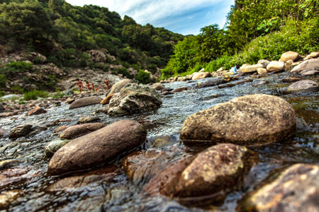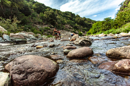 Tourists walking on rocks along a river in Sa Stiddiosa, Sardinia, Italy, enjoying a summer day surrounded by nature's beauty