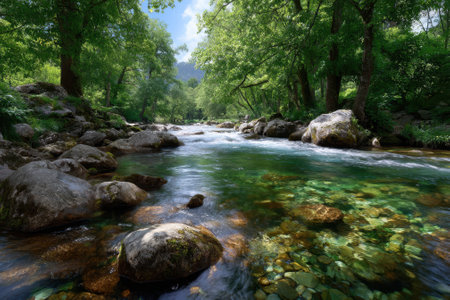 calm stream with many stones on the path, surrounded by much green forest in catalonia, spain