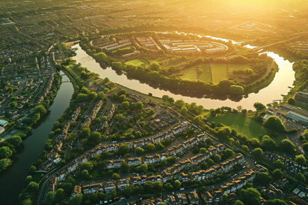 Explore a breathtaking landscape showcasing a meandering river nestled between vibrant greenery and distant city structures, evoking tranquility and natural beauty.