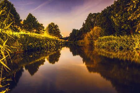 Sunset over the river in summer. Beautiful landscape with river and trees.
