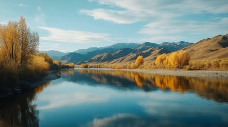 Autumn Landscape. The river, mountains, clouds and blue sky.
