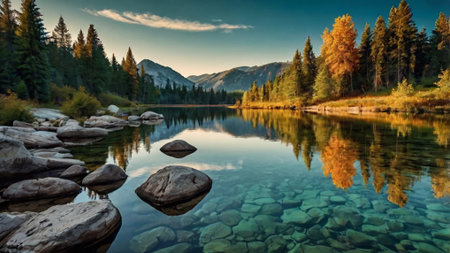 Serene autumn scene in chamonix, france, showcasing pine trees reflecting in a crystal clear Lake Gaillands with visible rocks