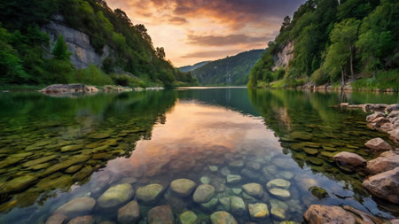 Peaceful river reflecting lush rainforest. Tranquil scene of nature's beauty.