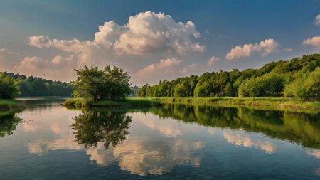 Beautiful landscape river with green trees and bushes on the bank as well as blue sky with clouds