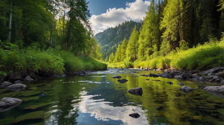 Panoramic view of the mountain river in the forest on a sunny summer day