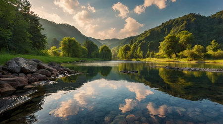Sunset on the river in the mountains. Beautiful landscape with trees.