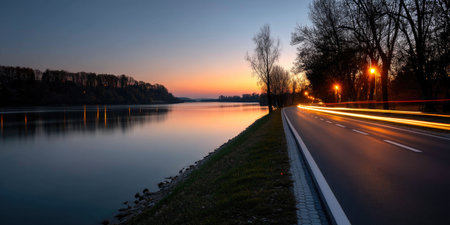 Scenic Road by the Lake at Sunset with Light Trails
