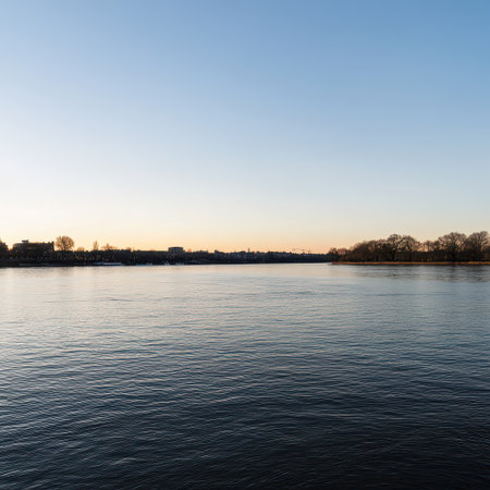 Beautiful River Landscape at Sunset with Glowing Sunlight Reflecting on Water