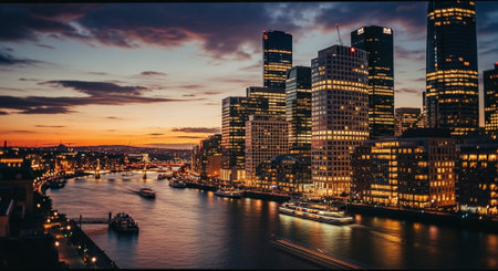 A tranquil river view at dusk showcases a stunning urban skyline, reflecting beautiful pastel colors. Perfect for travel and cityscape themes.