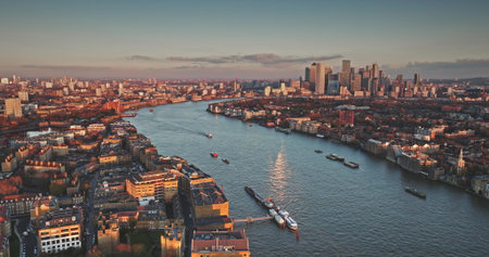 River Thames reflecting sunset warm light, flowing through London cityscape towards Canary Wharf, boats navigating, aerial view. United Kingdom, Europe. Travel destination. Drone flight