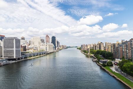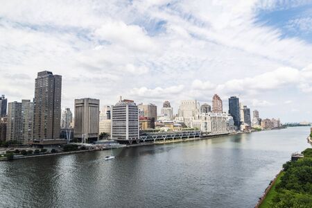 Elevated view of the Upper East Side skyline, Roosevelt Island and the East River in New York City, USA