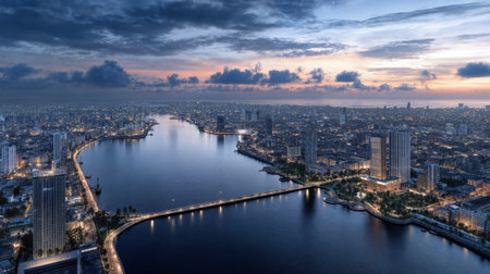 Aerial view of Lagos, Nigeria, at dusk, featuring a serene waterfront with modern high-rise buildings, illuminated streets, and a calm river reflecting the city lights under a partly cloudy sky.
