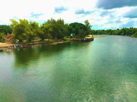 Natural river and fishing boats with retro filter