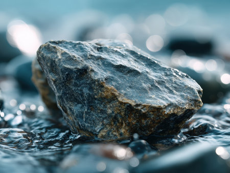Low angle detailed shot of water-worn stones scattered along a riverbank, featuring high contrast reflections, water drops, and soft bokeh fading into the background.