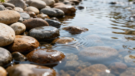A close-up of river stones with water gently flowing over them, creating soft ripples and reflections in a tranquil outdoor setting