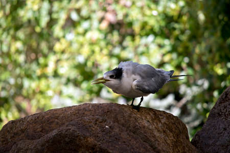 The Inca tern Larosterna inca bird has dark gray body, white mustache and red-orange beak and feet. Breeds on the coast of Peru, Chile and Ecuador South America.