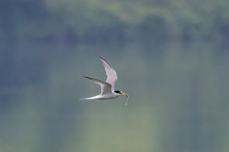 little tern (Sternula albifrons) in flight full speed hunting for small fish above a lake in Germany