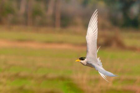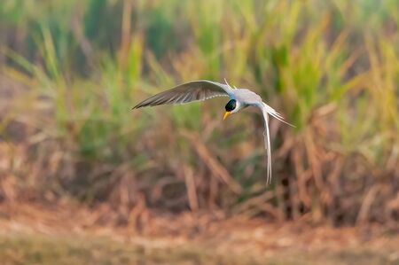 River tern or Sterna aurantia bird flying or hovering over river water with full wingspan for fishing in wildlife safari at forest of central india