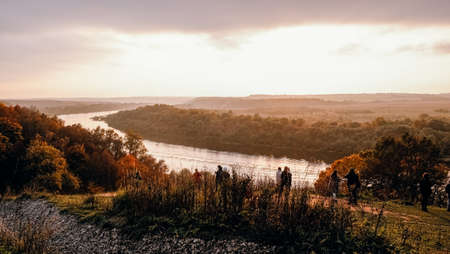 People stand on the observation deck on the mountain in autumn and watch the sunset, looking at the river and forest. Autumn beautiful landscape.