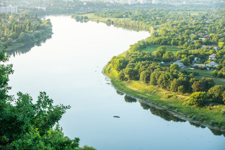 Beautiful summer landscape with river and blue sky in Belarus, Gomel, Soz river.